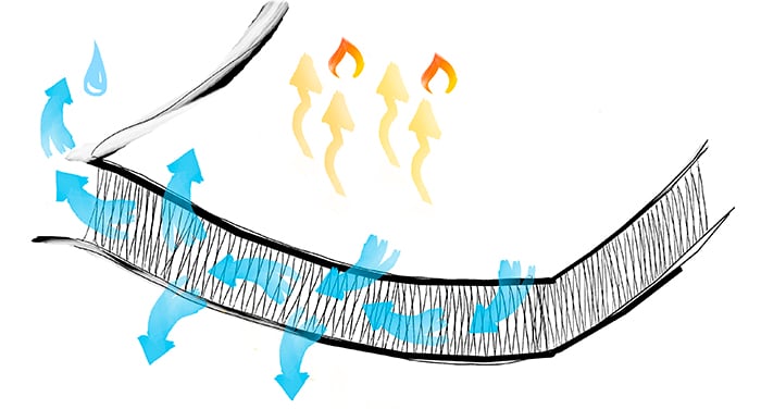 The outer and inner layers lead away heat and moisture, keeping the material dry. These are common characteristics of functional materials for, for example, thermal clothing and sportswear, but what makes spacer three-dimensional is the layer in the middle, the so-called spacer layer.