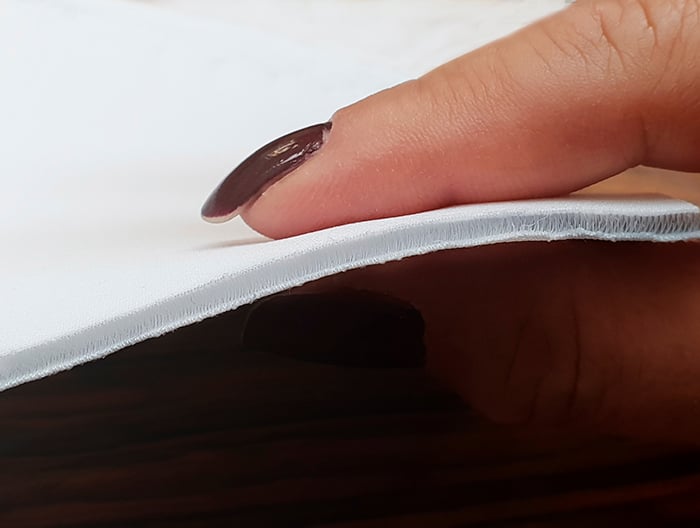 The spacer fabric is thick (usually between 1.5 and 5.5 mm) but feels airy and very light. It gives a lovely luxurious feel. Compare it with the normal foam padding of approx. 3 mm used in most bra models today and the spacer fabric is much lighter. If you press it between your thumb and index finger, the material feels suppressed and ‘fluffy’, like a sponge. It’s almost like that lovely feeling when you press bubble wrap – you just can’t stop pressing it!