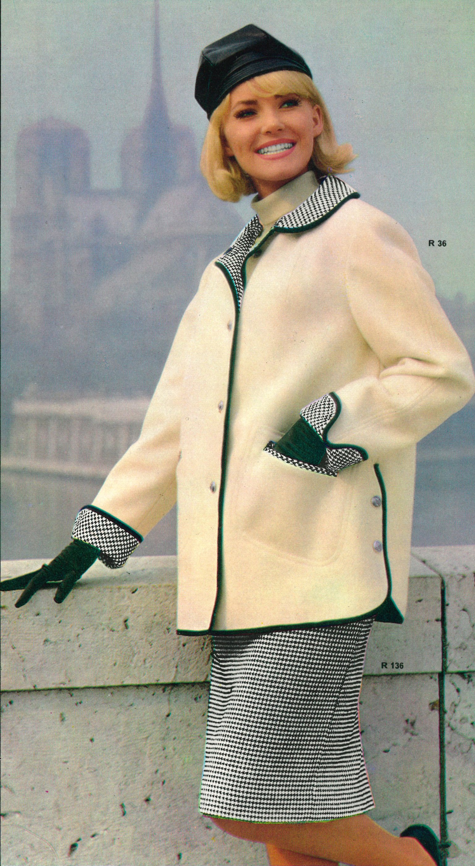 Jacka i creme med detaljer i hundtandsmönster och kjol i samma hundtandsmönster kombinerades med fördel med hatt och handskar för en komplett outfit, perfekt för kyliga höstdagar.