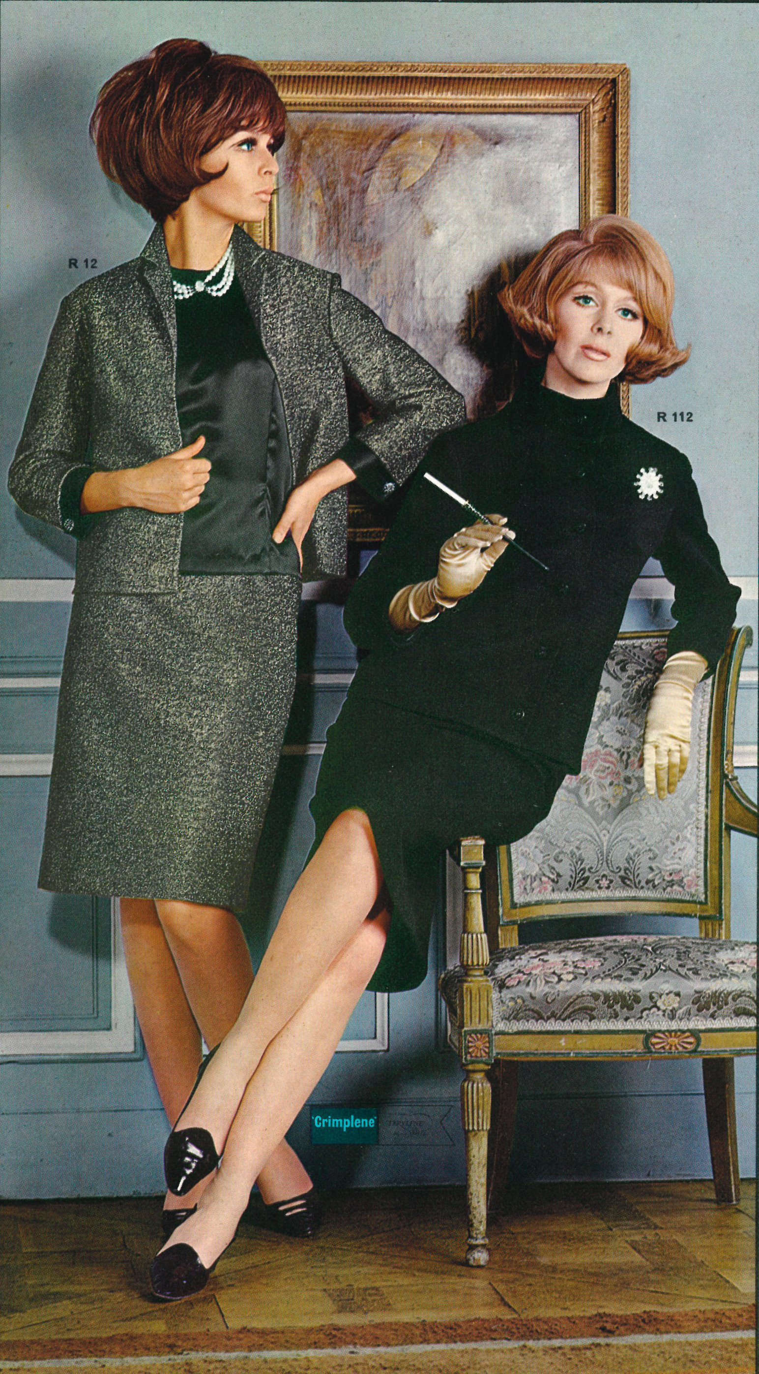 Ville man vara elegant klädd men inte vara för uppklädd var dräkten ett perfekt alternativ, jacka tillsammans med matchande byxa eller kjol. Till vänster på bilden nedan syns en tredelad ensemble med dräktjacka och kjol i jersey i lurextråd med gnistrande silvereffekt. Den svarta dräkten var tillverkad i crimplene i jerseykvalité och var en ”innedräkt som borde finnas i varje kvinnas garderob”.