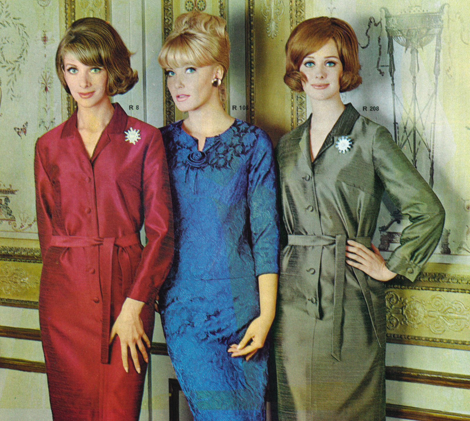 Ett urval ”eftermiddags klänningar” från mitten av 60-talet. De röda och gröna skjortklänningarna var tillverkade i acetat-siden medan den blå klänningen var gjord i mönstrad jacquard.