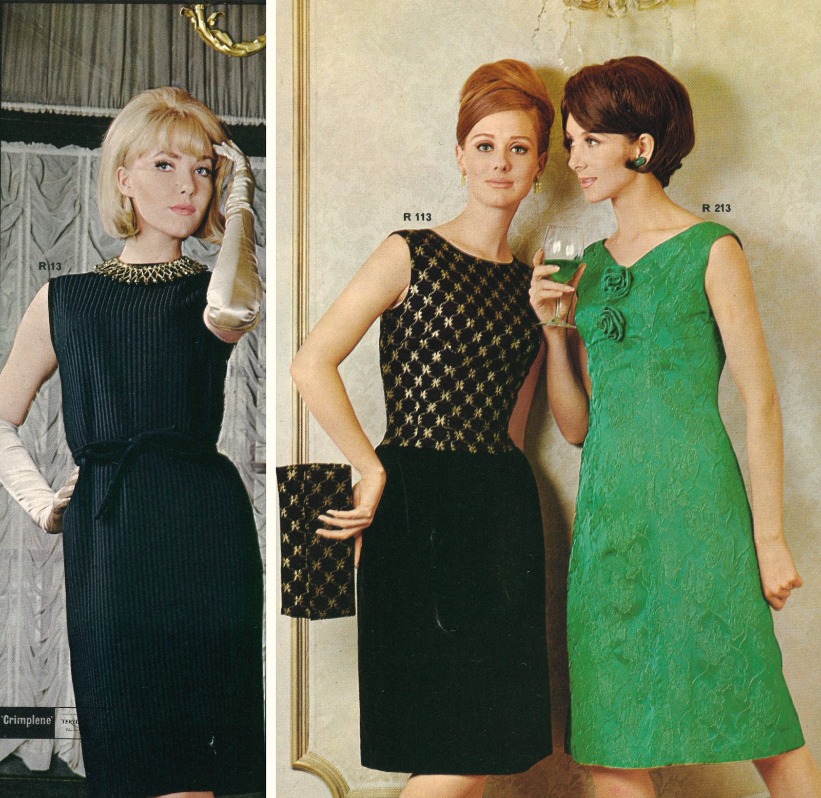 För kvällsbruk och finare tillställningar erbjöd vi även festplagg som denna trio med cocktailklänningar på bilden nedan. Till vänster syns en svart crimpléne klänning i vävd permanentplissering med höga handskar som pricken över i:et. Klänningen i svart och guld hade en överdel i mönstrad brokad och nederdel i enfärgad sammet. Den smaragdgröna klänningen till höger var tillverkad i sidenbrokad.