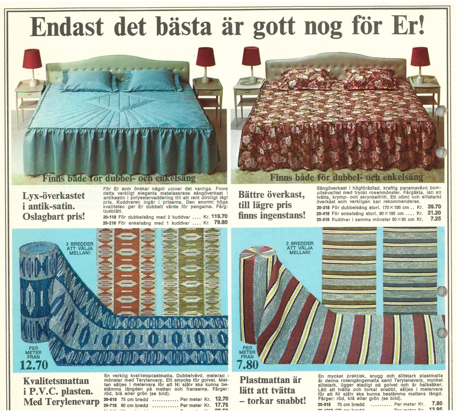 Men inte nog med det, vi sålde också hemtextiler som överkast, sängkläder, gardiner, handdukar och mattor. Vi hade både en skönhetsklubb och en växtklubb och sålde diverse småprylar för hemmet som fotbad. Handlade du från Miss Mary of Sweden skulle du inte behöva handla någon annanstans. Så här kunde det se ut i sovrummet under 60-talet.